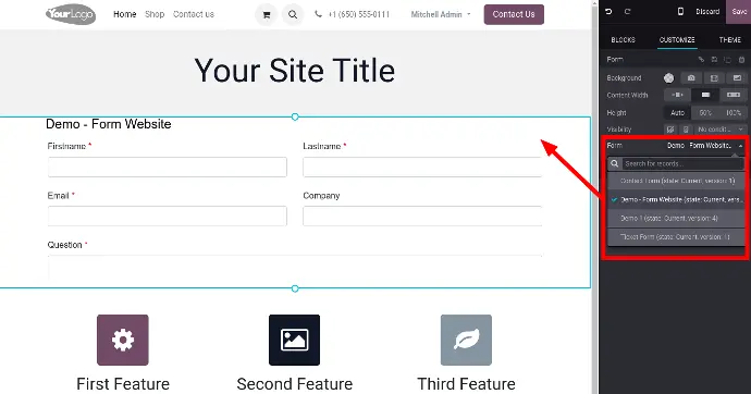 - Integrate Forms with other Odoo apps (modules), for example: CRM, Helpdesk, ERP, Sales, HR, shop, e-commerce, website